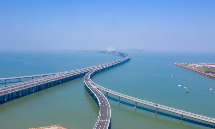 胶州湾大桥东起李村河互通,上跨胶州湾,中接红岛互通立交,西至黄岛东枢纽立交;线路全长约42.23千米、桥梁全长约31.630千米。投资近百亿元,历时4年建成,建成时曾经是世界上最长的跨海大桥。