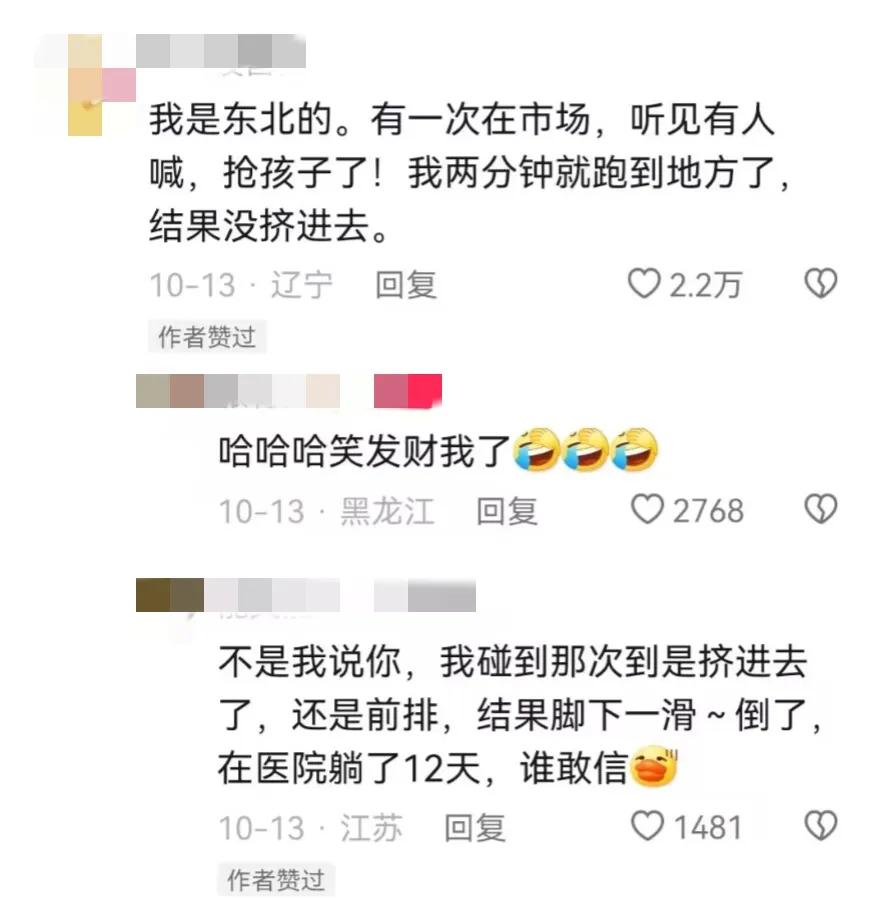 我是东北的。有一次在市场,听见有人喊,抢孩子了!我两分钟就跑到地方了,结果没挤进去。