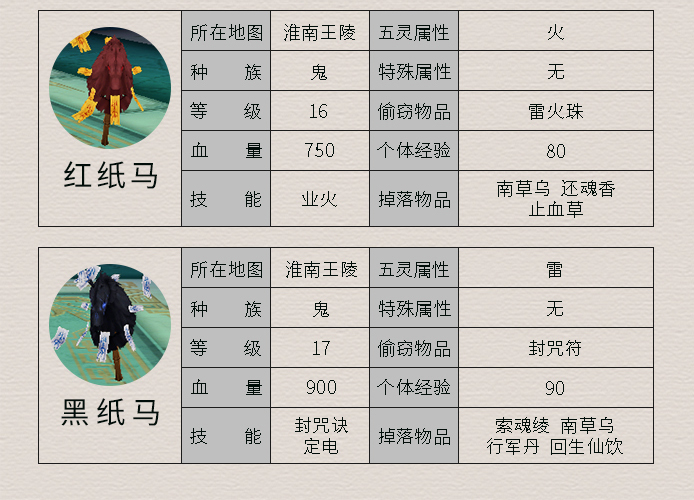 第一章“初涉尘世”,战斗场景地图有紫云架(顶部和底部)、太平村、湖边树林、柳府、八公山、女萝岩、淮南王陵、碗丘山、千佛塔,期间出现的各种怪物及其各项属性如下: