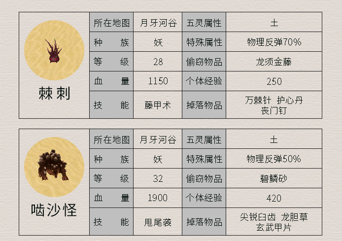 第二章“寻仙昆仑”,战斗场景地图有太一仙径(紫薇道/白灏道/寂玄道)、须臾幻境(酒、财)。月牙河谷、剑林、醉花荫、狐仙居、神农洞(烈焰洞和炙炎洞)、百翎洲,怪物图鉴如下:
