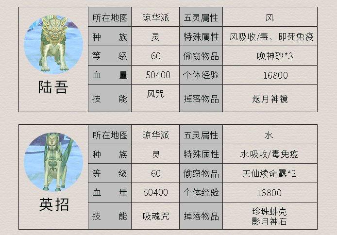 第四章(终章)“死生悠茫”,战斗场景地图有飞升后的琼华派和卷云台,怪物有(战斗对象)琼华派弟子(3类)、四圣兽(开明兽/离朱/陆吾/英招)以及终极BOSS玄霄和夙瑶,图鉴如下: