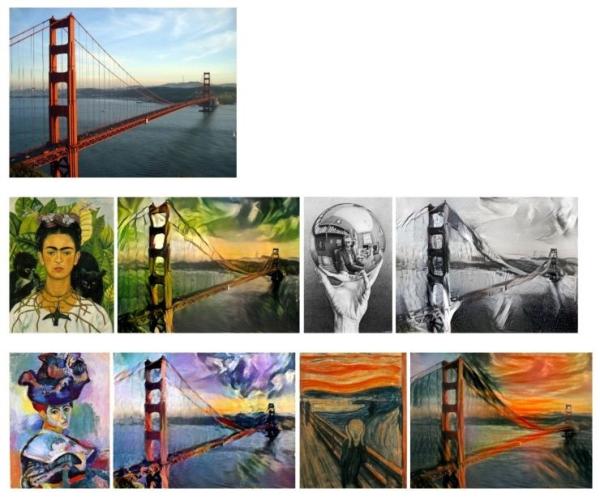 另一个例子就是风格转换,给机器一张风景照,它能“再创造”,把图转成梵高风格的画作。