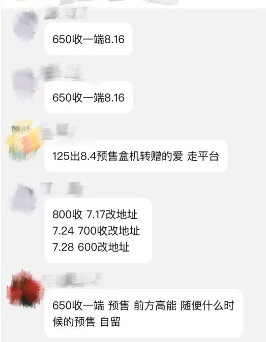 在一些二手平台,目前Labubu3.0一端(整盒内含6个盲盒)普遍挂价仍在1500元以上,有的甚至挂价到2800元,但在黄牛群中,随着预售开启,Labubu3.0系列价格下探,大家普遍出价在650元至800元收一端(整盒内含6个盲盒),也有卖家出价1200元出自己手中抢来的预售,但无人响应,群内有人接话说:“已经崩盘了,700元至800元可收。”有黄牛表示,随着离预售日期越来越远,其给出的报价也递减。