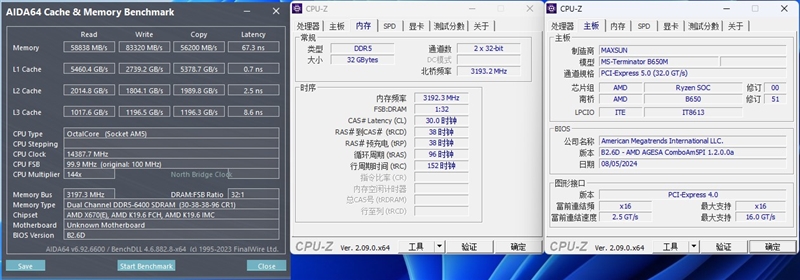 搭配锐龙7 9700X处理器,将内存频率设置为6400MHz,FCLK=2000MHz、UCLK=MCLK=3200MHz,实测内存读取、写入与复制带宽分别为58838MB/s、83320MB/s、56200MB/s、内存延迟67.3ns。
