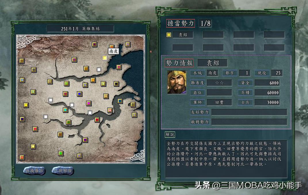 在历史中,袁绍是从正面吞并了公孙瓒的,但是在《英雄集结》这个经典剧本中,我们经常会发现公孙瓒总能消灭袁绍,最终变成一统河北的霸主,之所以这样,除了袁绍本身的原因之外,还跟公孙瓒被设计得很强这一因素息息相关。在游戏里,公孙瓒势力下不仅清一色的白马武将,而且开局就有三级骑兵科技,所以公孙瓒别看手下人数不多,但是基础战力是极具优势的。另外还有一个点是,公孙瓒开局的地理位置特别棒,比袁绍明显要强得多。正是这些原因综合下来,导致了袁绍经常干不过公孙瓒。