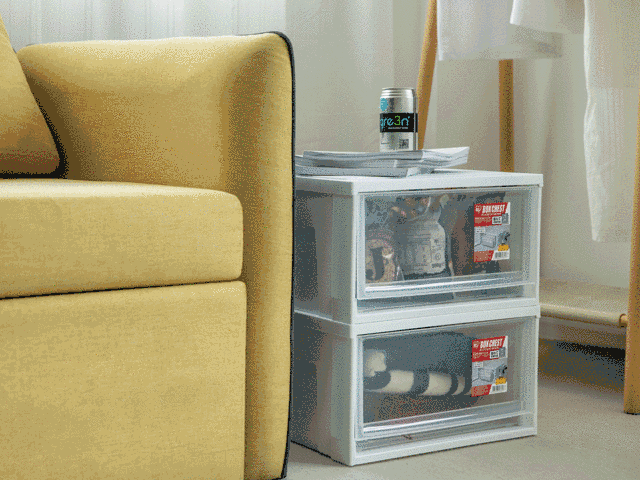 不同的杂物、衣物,可以分类放在不同颜色的收纳盒中。