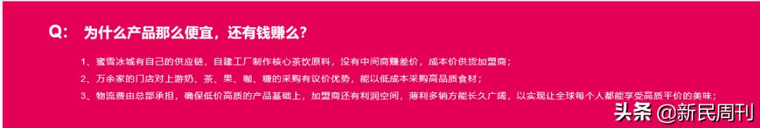 在加盟页面上,蜜雪冰城也回应了加盟商的疑惑:产品卖得这么便宜,加盟商真的能赚钱吗?