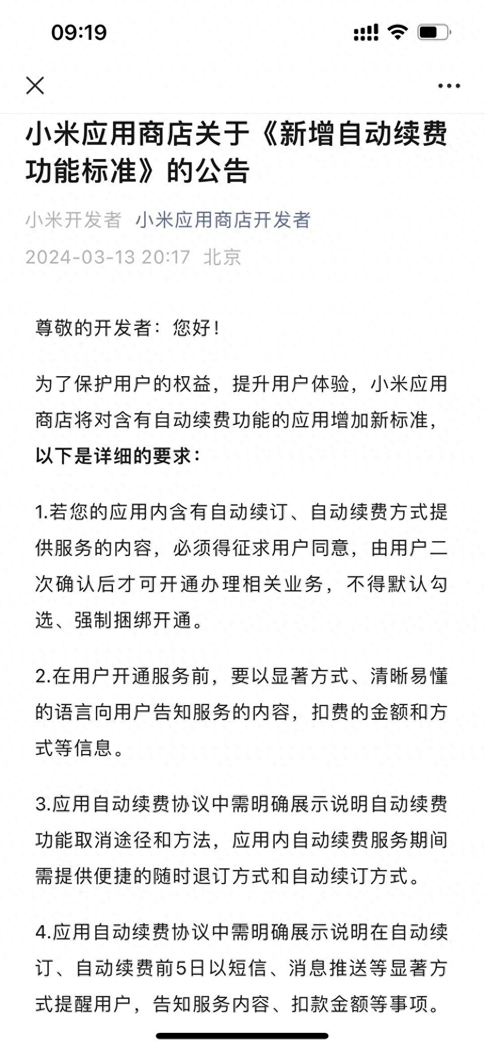 4月13日,小米应用商店此前宣布的《新增自动续费功能标准》条例已经正式实施。