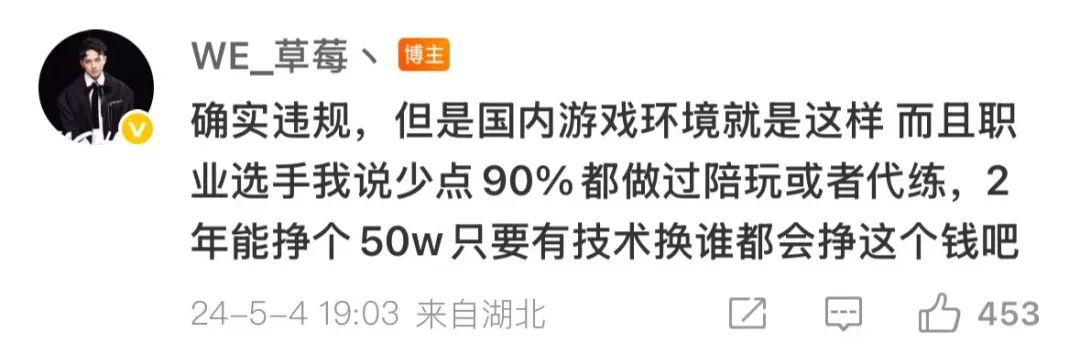 “ 胖猫 ” 事件的时候,前 WE 战队成员草莓说过这么一段话:“ (代练)确实违规,但是国内游戏环境就是这样,而且职业选手我少说点 90% 都做过陪玩或者代练,2 年能挣个 50W 只要有技术换谁都会挣这个钱吧。 ”