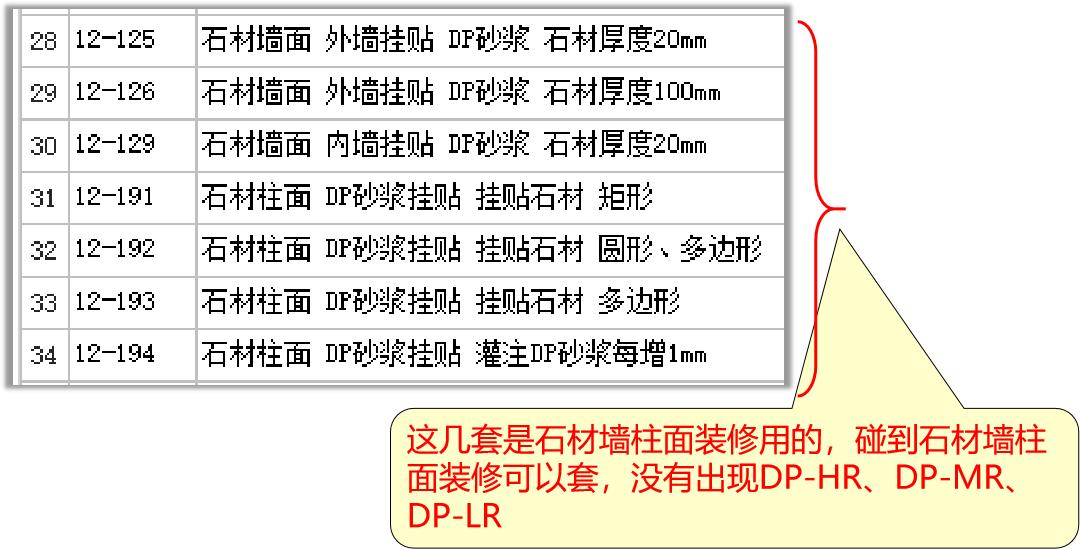 28~34条子目是石材墙面装修的时候,用到DP砂浆,我们碰到石材装修的时候,套这几套子目,如图所示。