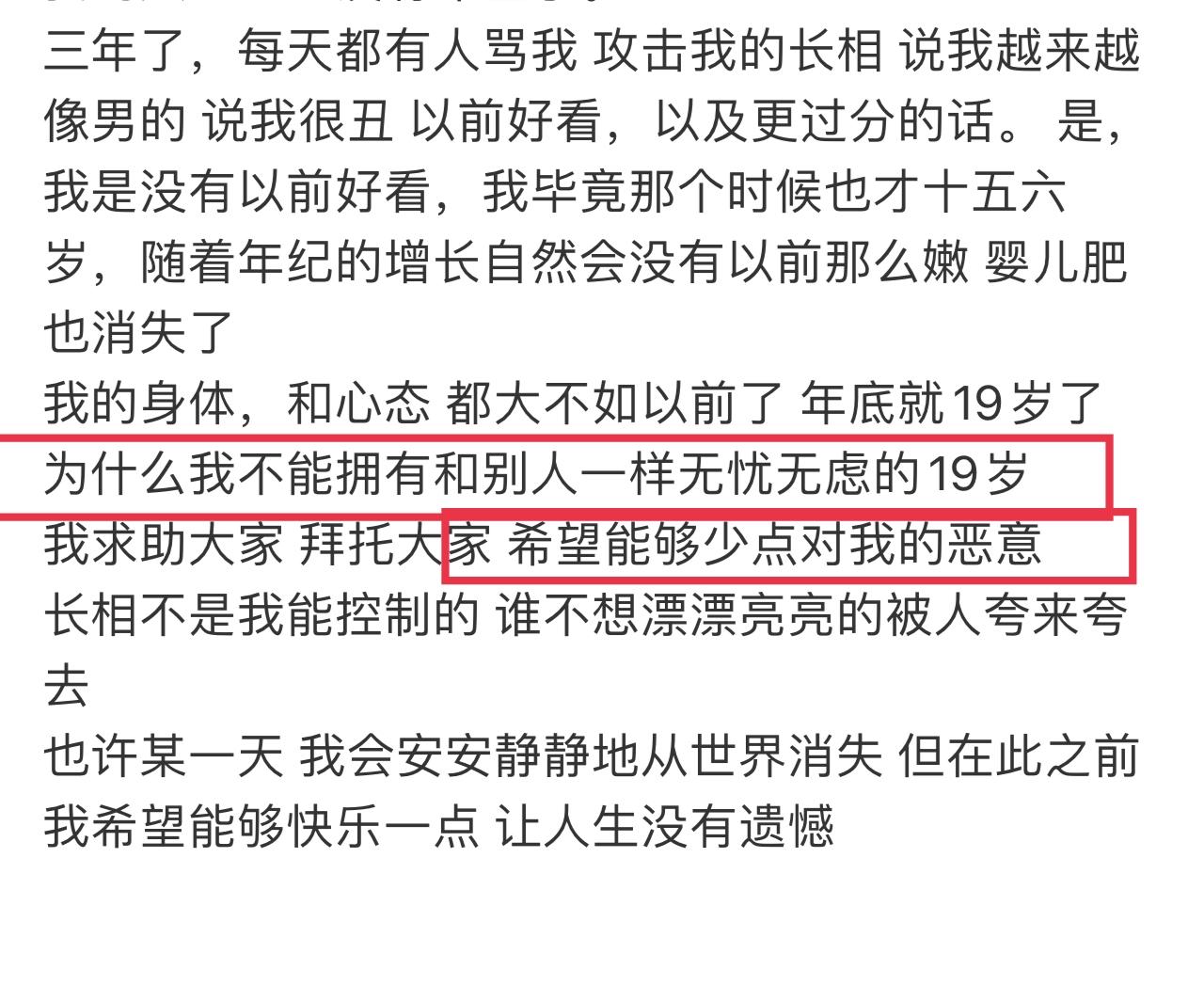 最后,他反问网友:“为什么我不能拥有和别人一样无忧无虑的19岁?”还呼吁大家“希望能对我少些恶意”。