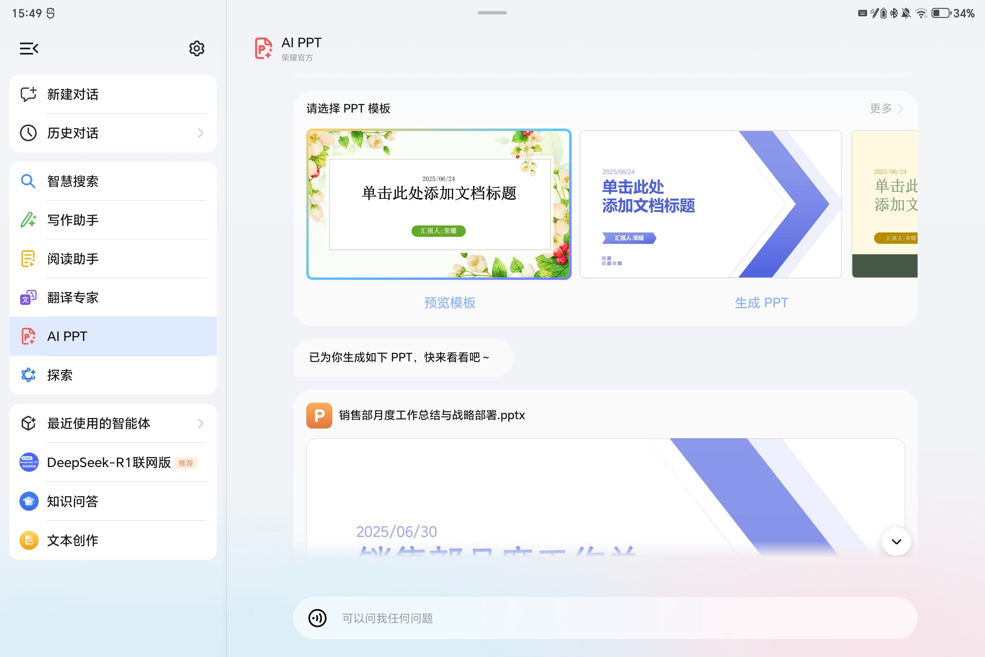 除了上述介绍到的用文档快速生成PPT外,荣耀平板MagicPad3还开放了从0快捷生成PPT的功能,并且还是免费开放给所有MagicPad3的用户进行使用,这类功能无论是PC还是平板电脑,大多需要借助第三方APP付费使用,而荣耀将其融合在YOYO助手中免费开放。