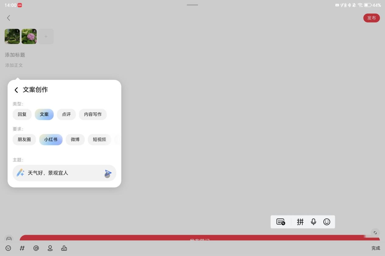 再比如在社媒类的APP中,AI文案创作可以针对于文案类型与发布平台进行针对性的文案创作。