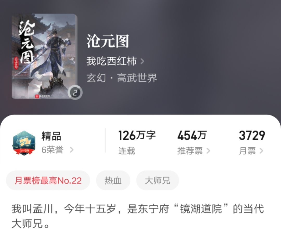 日更两千字,白金大神我吃西红柿新书《沧元图》跌至起点月榜35名