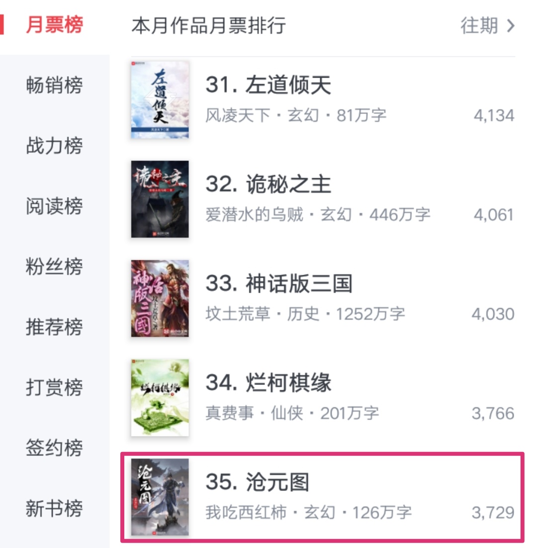 另外由于他目前这个佛系状态,《沧元图》在起点各大榜单上的表现,还是有明显跌幅的。月票榜上已经从以前的二十五名上下,跌到了三十五名,畅销榜上也是类似的这种情况。