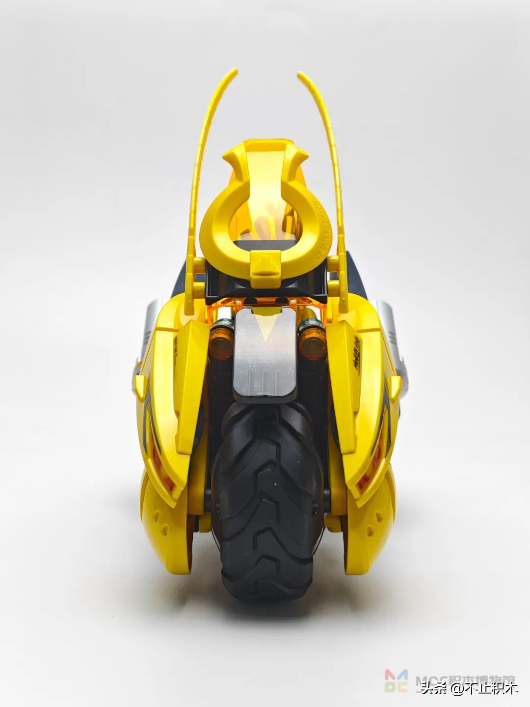 ▼完成!这辆摩托车的造型设计也很炫酷,也有赛博朋克的风格,中间的驾驶位也能很好将积木人放进其中。