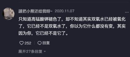 在将高锰酸钾注入双氧水的实验中,史家昕做出了“一个倾其所有,一个无动于衷”的解读,评论区也不甘示弱,给出了“你只知道高锰酸钾褪色了,却不知道其实双氧水已经被氧化,它已经不是双氧水了,你以为它什么都没有变,其实因为你,它已经不是它了”的浪漫升华。