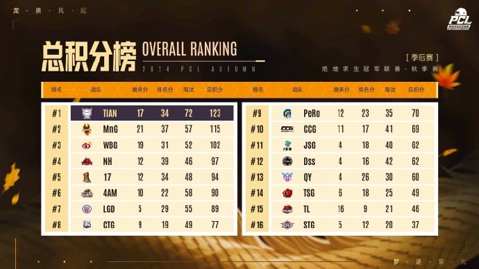 季后赛DAY2结束,天霸仍以123分领跑,MnG超至第二名。