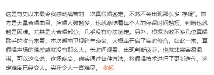 其在鉴定湖南卫视跨年晚会真假唱的文中称,这是有史以来最令其痛苦的一次真假唱鉴定,不然不会出现那么多“存疑”。“首先是大量合唱曲目,演唱人数越多,也就意味着每个人的停留时间越短,判断也就越是困难。尤其是大合唱部分,几乎没有办法鉴定。另外,根据为数不多几位真唱歌手的收音来看,本次湖南卫视跨年晚会,大概率开启了实时修音,如此一来,真假唱声场的落差感就没有那么大,长时间观看,出现判断疲劳,也就非常容易混淆。可以这么说,这场晚会,确实通过各种方法,将假唱技术进行了更新迭代,鉴定难度已经变大。实在令人一言难尽。”
