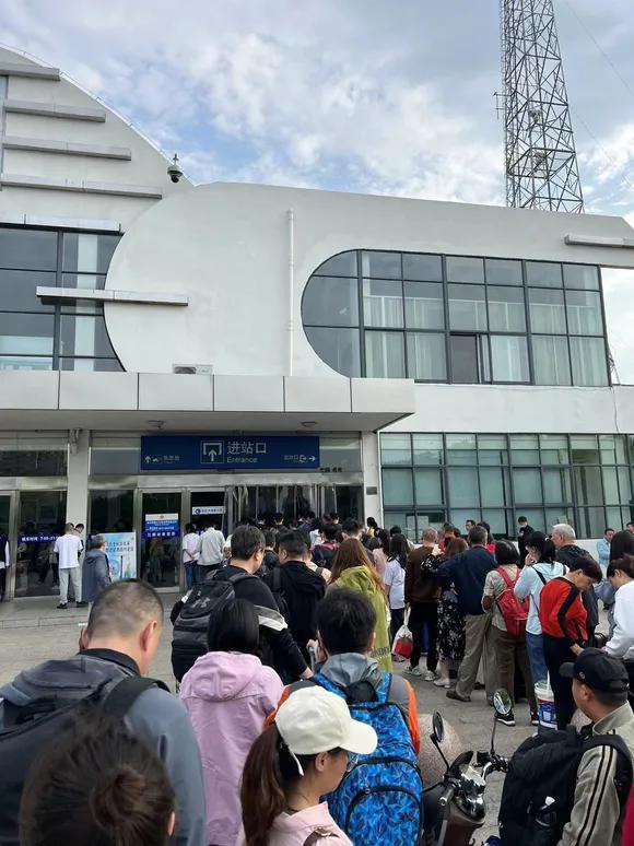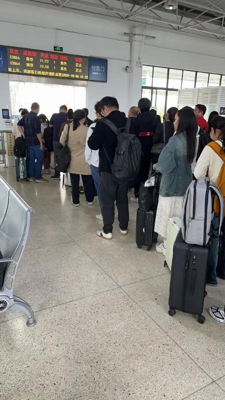 旅游客人已经排到候车厅的外面了,人实在是多
