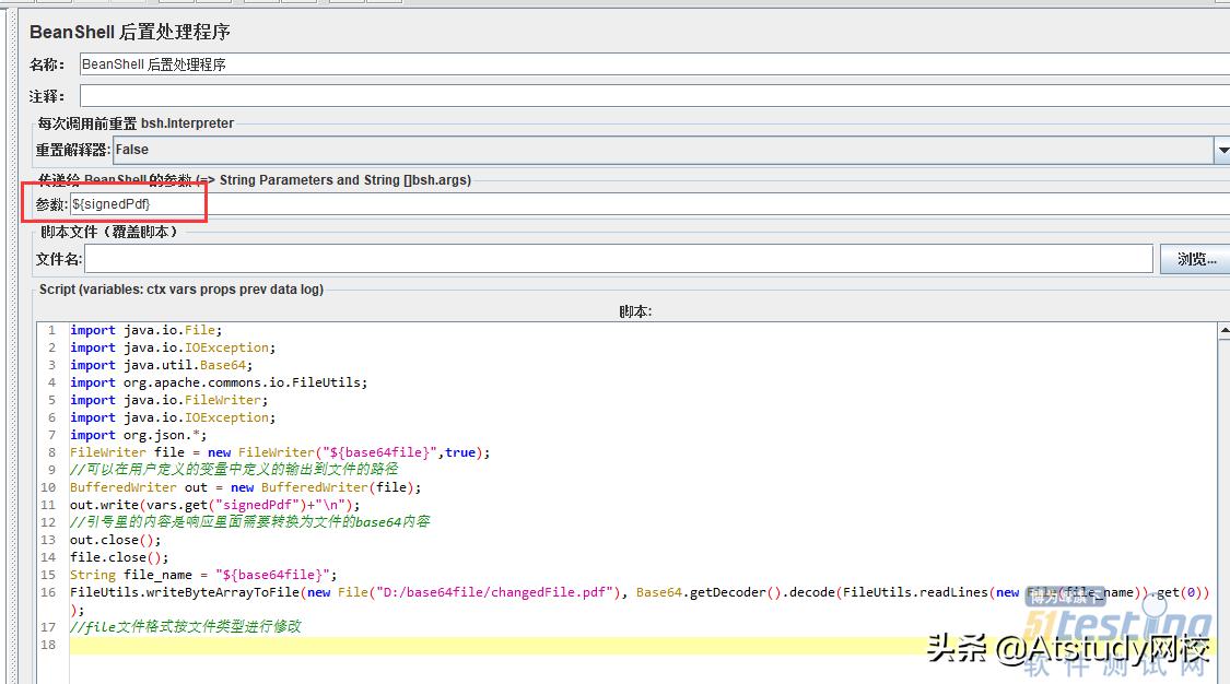 在需要转换为文件的请求中添加后置处理器-BeanShell后置处理程序,对需要转换base64为文件的请求中添加正则表达式提取器,变量名称为“signedpdf”,在下方参数栏中传入该参数。