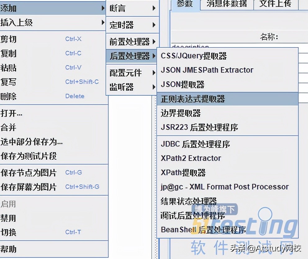 正则表达式提取器又称作关联,可以把Response的值提取到变量中,提供给别的Http Request使用,在对应的需要获取关联的请求处右键添加后置处理器-正则表达式提取器来添加。