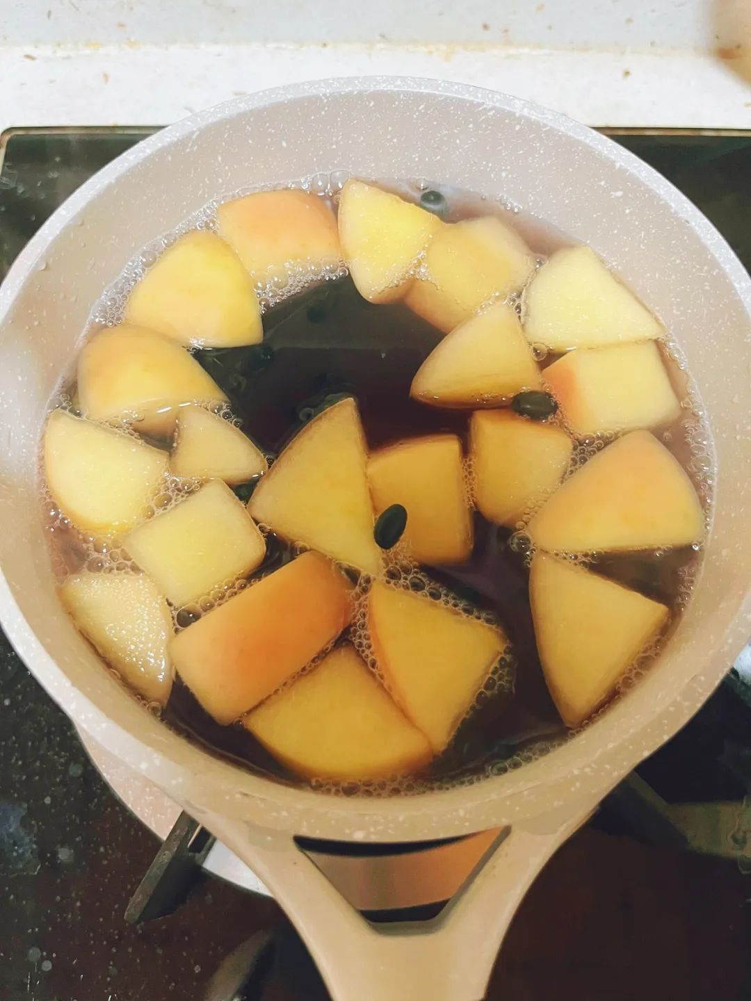 3. 将泡好的黑豆、怀山药块、苹果块放入锅中,加入清水。