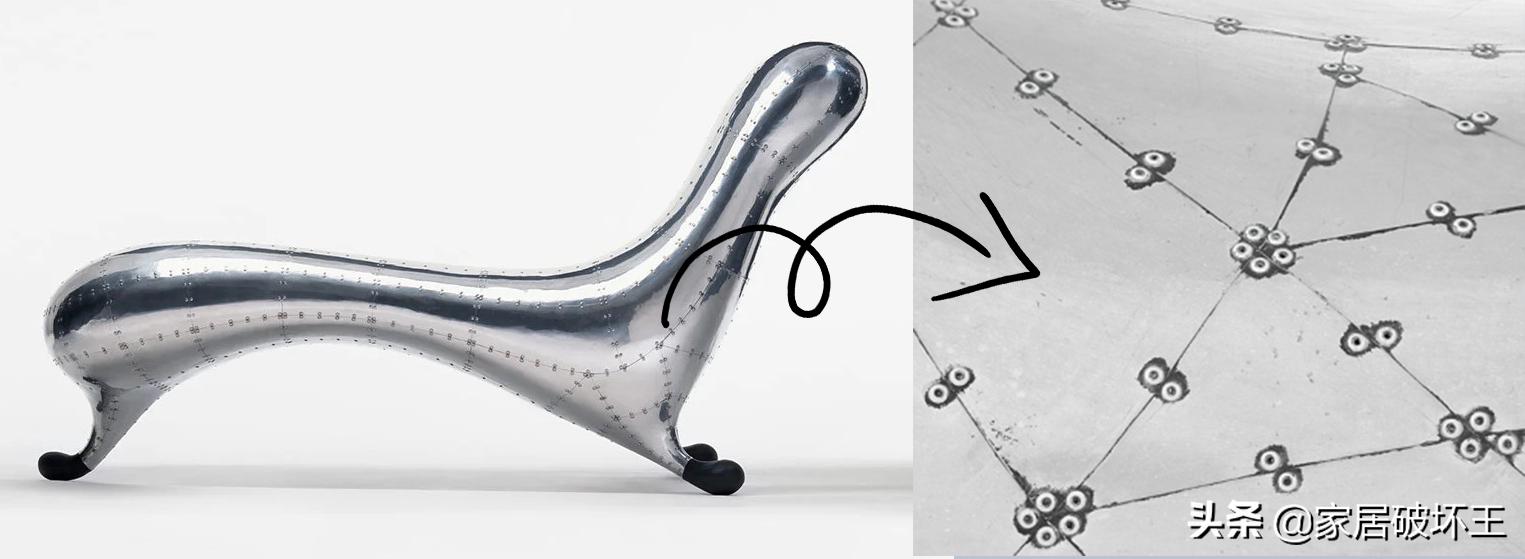 这款沙发采用的是镜面抛光的不锈钢材质,在材质上并没有什么特别,甚至很普通,设计上反而有些别具一格,它是由英国/以色列的工业设计师Ron Arad在1995年设计的。