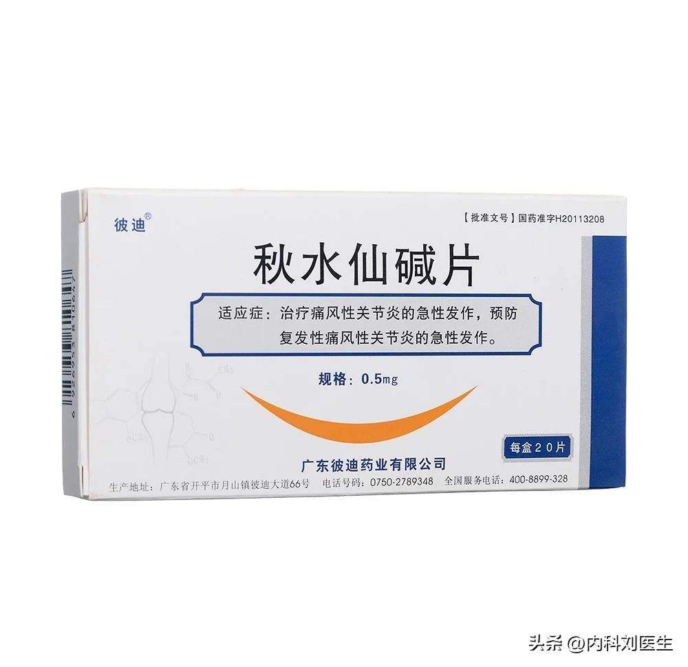 用于预防复发时,秋水仙碱的标准剂量是每日0.5~1.0mg,分1~2次口服(多数患者推荐每日1次),疗程3~6个月。每日腹泻≤2次,可减量至0.5mg/天;腹泻≥3次/天、血便、肌无力等,需立即停药并就医。
