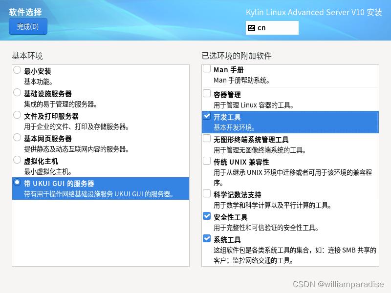 左边选带GUI,右边根据自己实际情况进行勾选,当然后面也能再安装,我个人习惯统一都勾选如下内容: