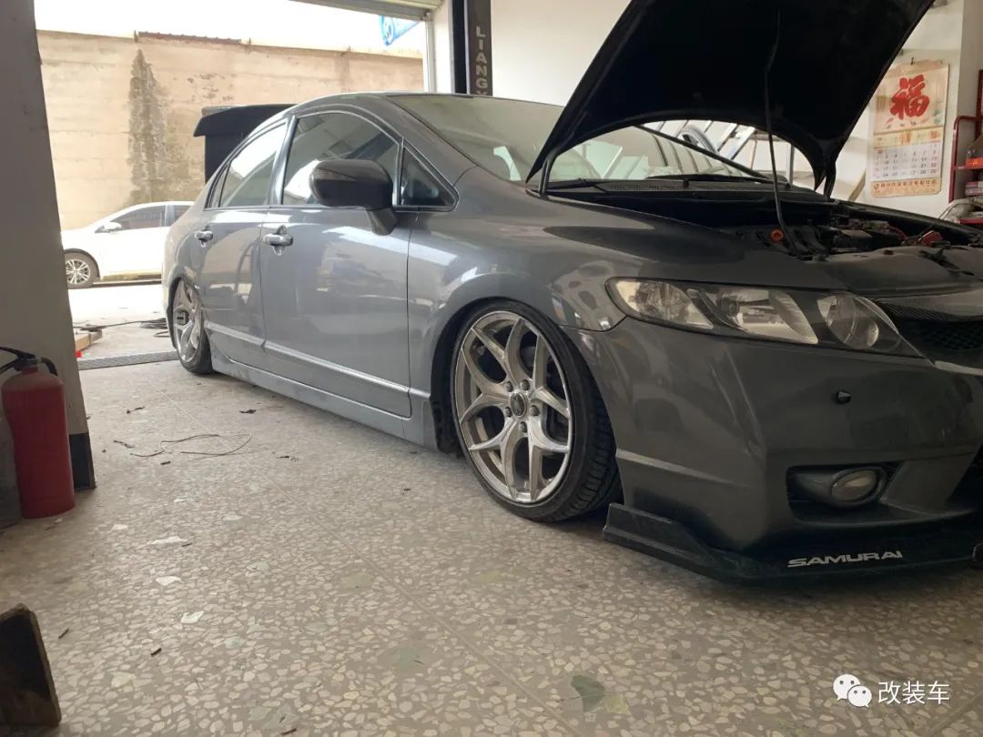 "那时候作为刚接触改装的小白,我给这辆8代思域第一样安排上车的改件是一套18寸轮毂,上车的效果不仅蹭叶子板,而且还很丑!于是就安排了一套二手的基础版气动,那时候趴下来的姿态就已经很帅了。"