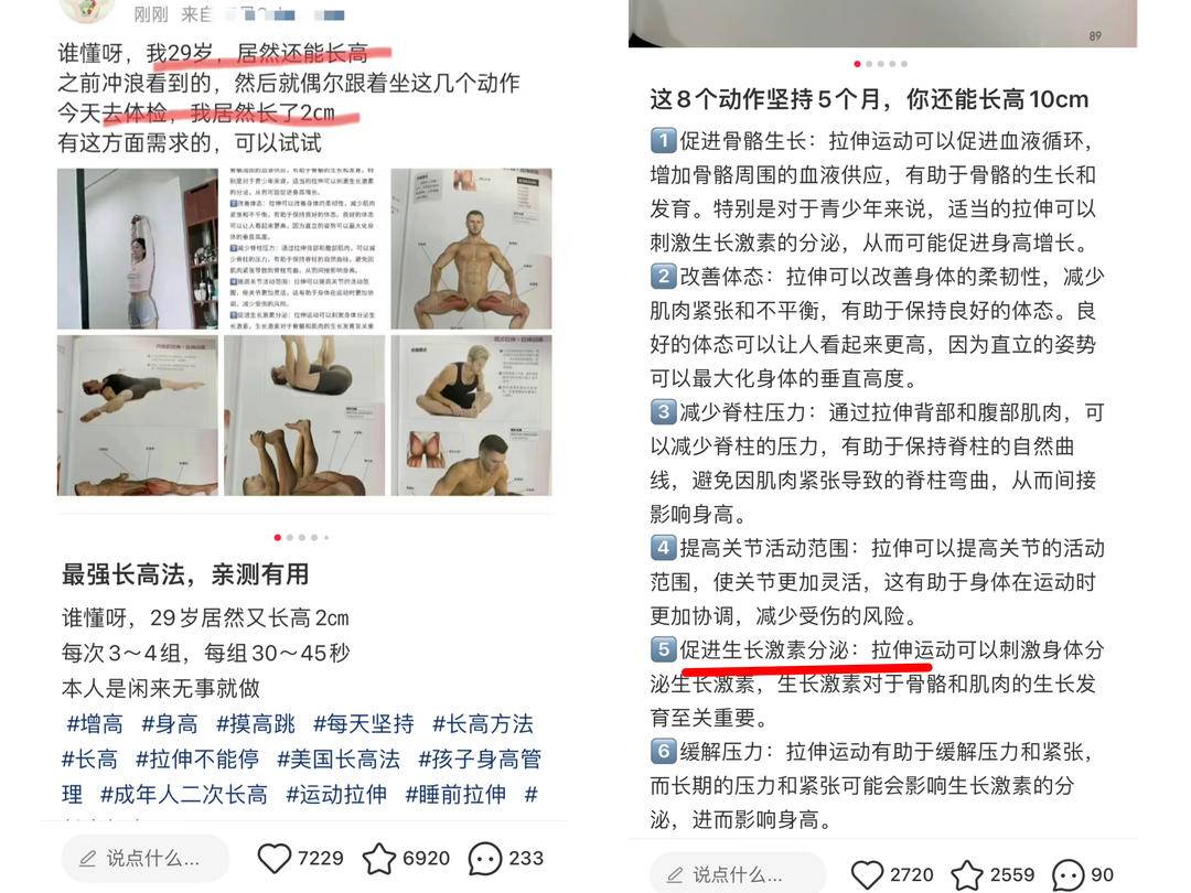 “最强长高法!29岁居然又长高2cm!”近期,在社交平台关于夏季运动与拉伸的讨论热度不减,其中“拉伸能帮助成年人长高”这一观点引发关注。很多人都知道,成年人骨骼闭合后,身高也就按下了“暂停键”。但不少博主亲测有效的拉伸长高图,让不少人心动不已,“长高10cm夸张了,但1-2cm还是可以的!”记者注意到,他们普遍认为这可能与锻炼导致生长激素分泌有关。
