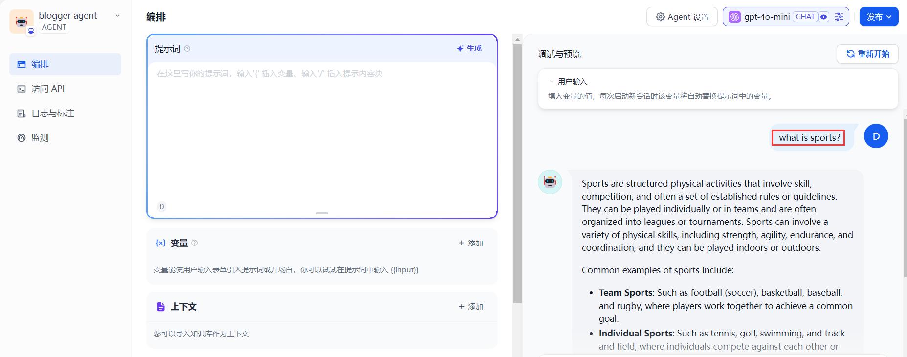 左边有一系列参数,包括了指令,也就是系统提示词级别的信息。变量,可以设置参数,Context上下文,通常我们可以将本地知识库引入Agent,就具有了知识库的信息。