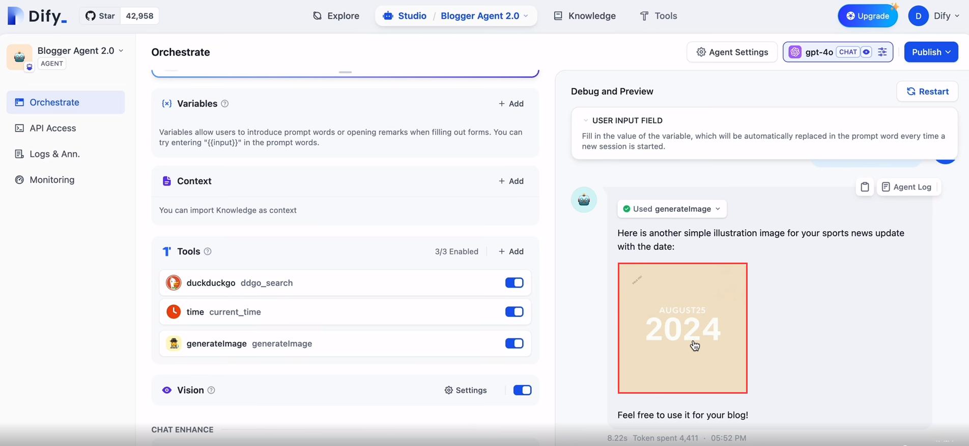接下来我们就在在Dify Studio中,从零开始创建Agent,在主界面的顶部菜单选择Agent,首先需要给Agent起个名字,我们就叫他“Blogger Agent”吧,然后进入编辑界面,我们选择的大语言模型是GPT-4o,这样他可以帮助Agent更加稳定的完成任务的执行。