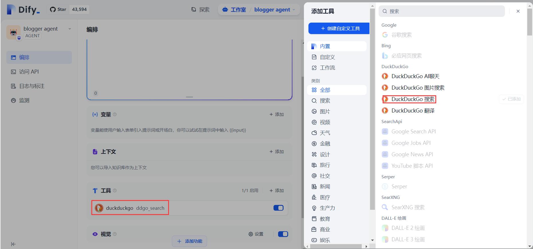 接下来我们为Agent添加一个Tool,DuckDuckGo,让Agent拥有了搜索的能力,这个搜索工具,这个工具是Dify内置的工具,我们不需要做任何的开发和配置。
