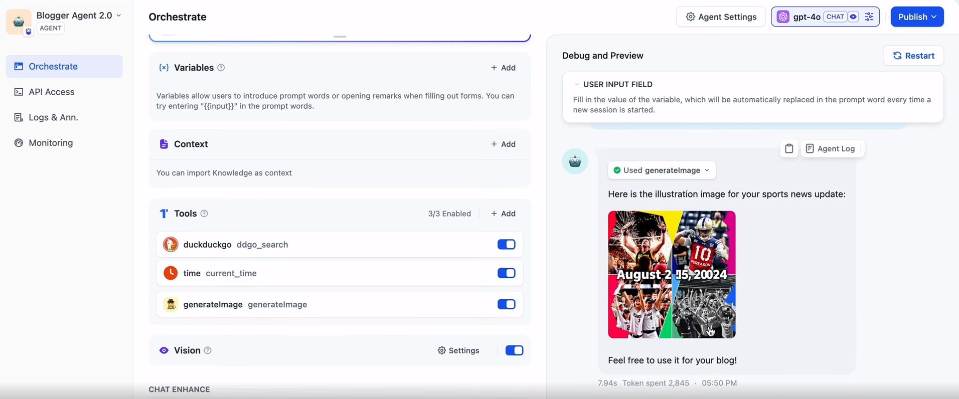 现在Agent里有三个工具,咱们还是做跟刚才同样的事情,我来问问昨天的体育新闻有哪些。接下来我就希望基于这些新闻能够生成一张插画。不过看起来似乎中间这个时间还略有差池,没关系,这个是图片生成插件的问题,而不是Agent本身的问题。