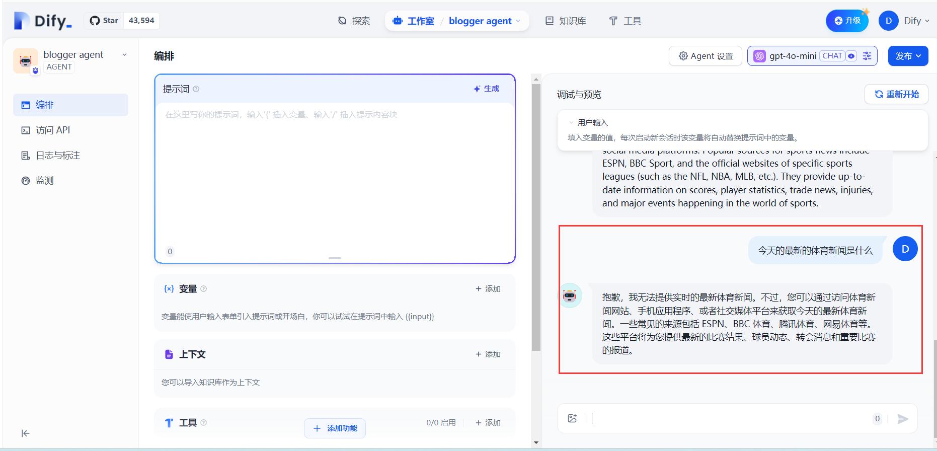 我们继续提问,比如我们想知道今天的体育新闻:今天最新的体育新闻,Agent就拒绝了我们,他表示自己不知道,