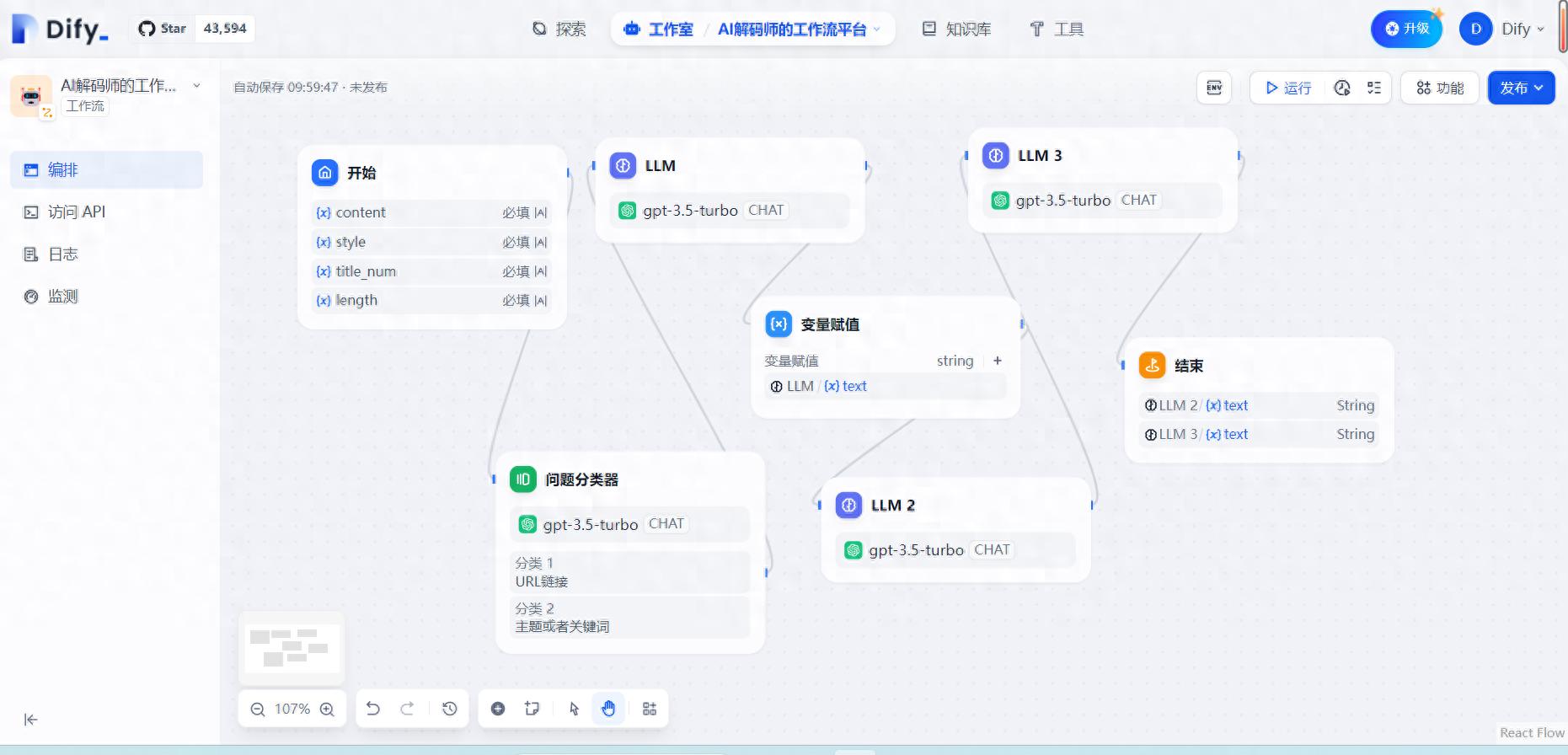 接下来,作者就来分享如何在Dify平台上创建一个Agent,并看看它能为我们做些什么。在创建之前我们还是先看下工作流长什么样,这样容易在后边我们介绍Agent的时候做一个对比