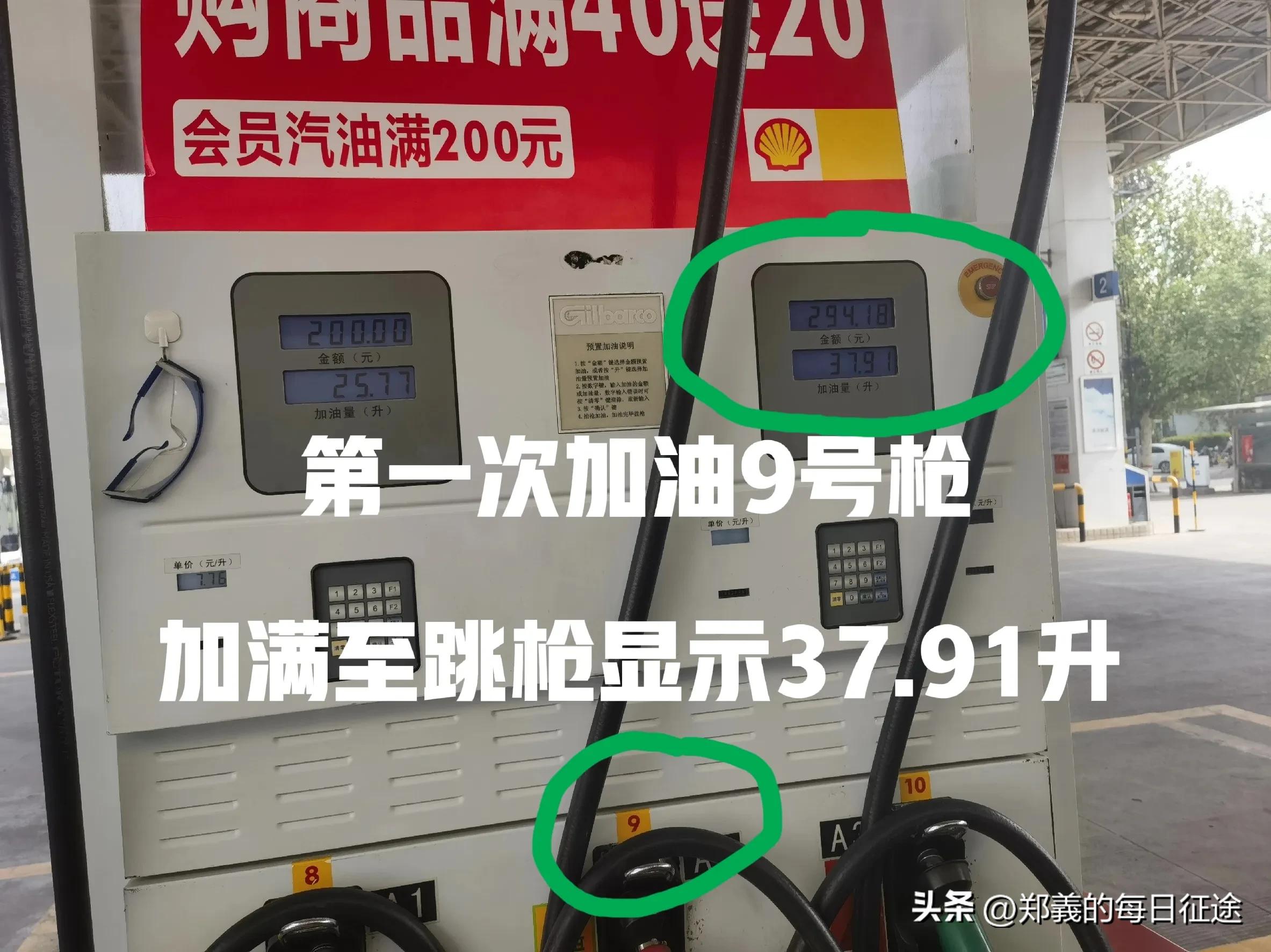 通过真实纪录:第一次在加油站92号汽油加满(跳枪止)共计37.91升,花费294.18,当日油价7.76/升;加满油,车内仪表里程表显示523534公里,仪表小计里程也已清零!