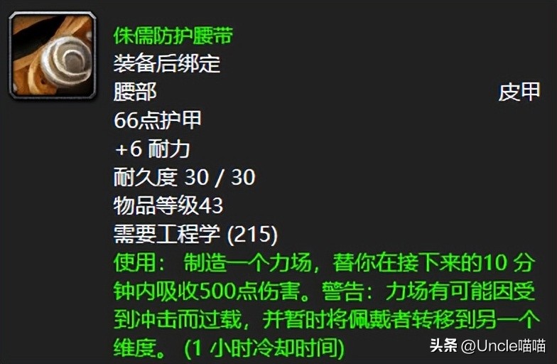 如果你是资深野外PVP的工程学玩家,那么喵叔觉得你必定是知道这款侏儒防护腰带的,别看10秒内的500点伤害吸收,重点是维度的转移,相当你处于虚无状态,无敌之姿敌对玩家亦或者野怪根本碰不到你,待得解除之后喵叔我相信你的技能也差不多又一轮CD了吧,真心好用,特别是小号盗贼这种拿了别提多实在。