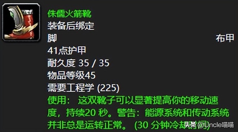 火箭靴的话,真的是无人不知无人不晓的神器,你说团本走位带着自有妙用,战场扛旗跑路更加是让你犹如无人之境来回穿梭在战歌峡谷。不过相对来说侏儒火箭靴会异常稳定,但是用过地精火箭靴的应该知道,那东西一不小心可是要炸裂的啊。