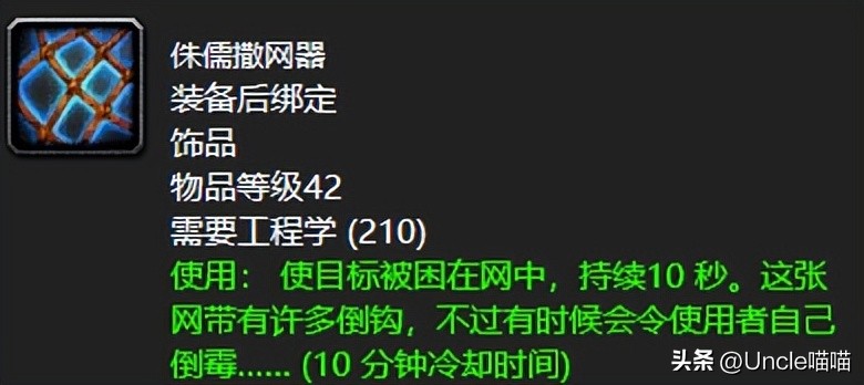 喵叔只要玩战士和盗贼是必须会打卡侏儒撒网器的,搭配上冲锋亦或者是疾跑来说,追击小联盟的无敌加持。当然唯一的缺点就是这东西运气不好会适得其反让自己寸步难行,不知道阁下用这东西脸黑不黑呢?