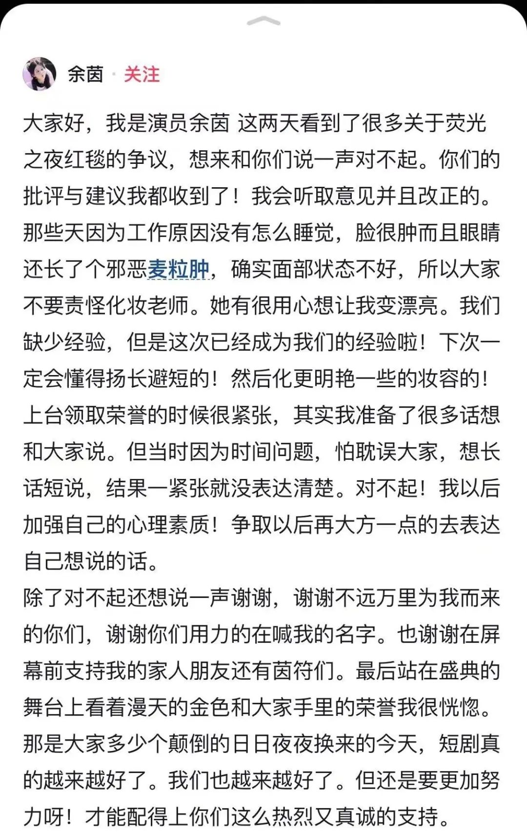 据悉,3月14日,爱奇艺荧光之夜红毯上,短剧女演员余茵被吐槽红毯状态不好,“颜值和身高都一般”。对此,余茵发长文回应:“确实面部状态不好!会难过但不惧怕,我的确就是一个普通得不能再普通的女生。”