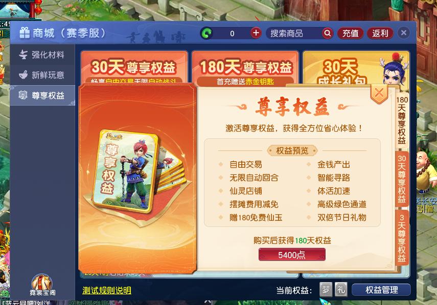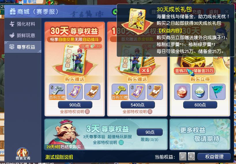 如果你想拥有自由交易和金钱产出等权益,就需要购买尊享权益礼包。尊享权益礼包共有三种,分别是3天(90点)、30天(900点)和180天(5400点),每种礼包对应的权益和绿色通道有所不同,建议有需求的小伙伴根据自身情况购买。
