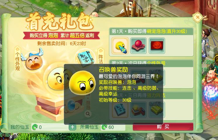 当你升到10级并拜师后,可以开启“首充福利”(60仙玉),首充礼包返利共计三天。