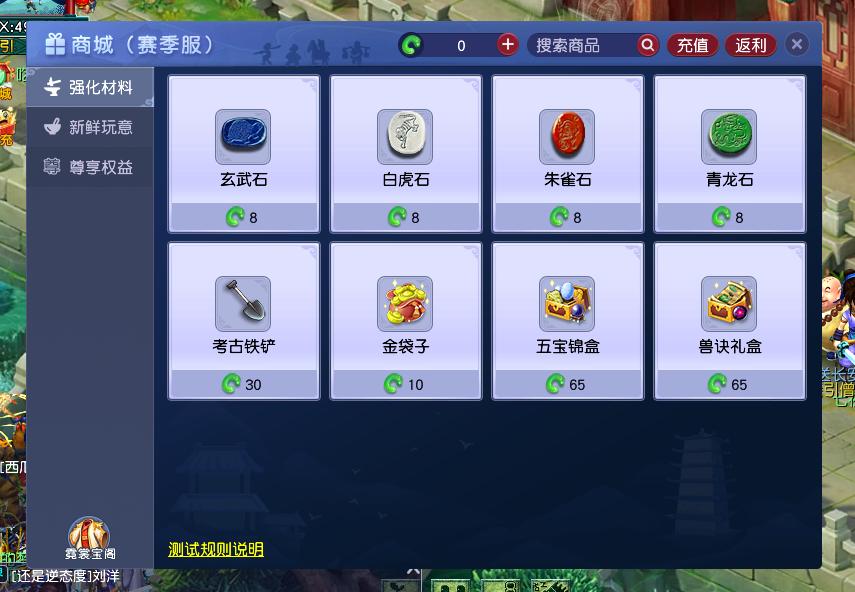 除此之外,赛季服是有专属商城的,里面可以花费仙玉购买强化石、考古铁铲、五宝、兽诀、人参果、如意丹、染色道具、秘制红蓝等常用消耗品。