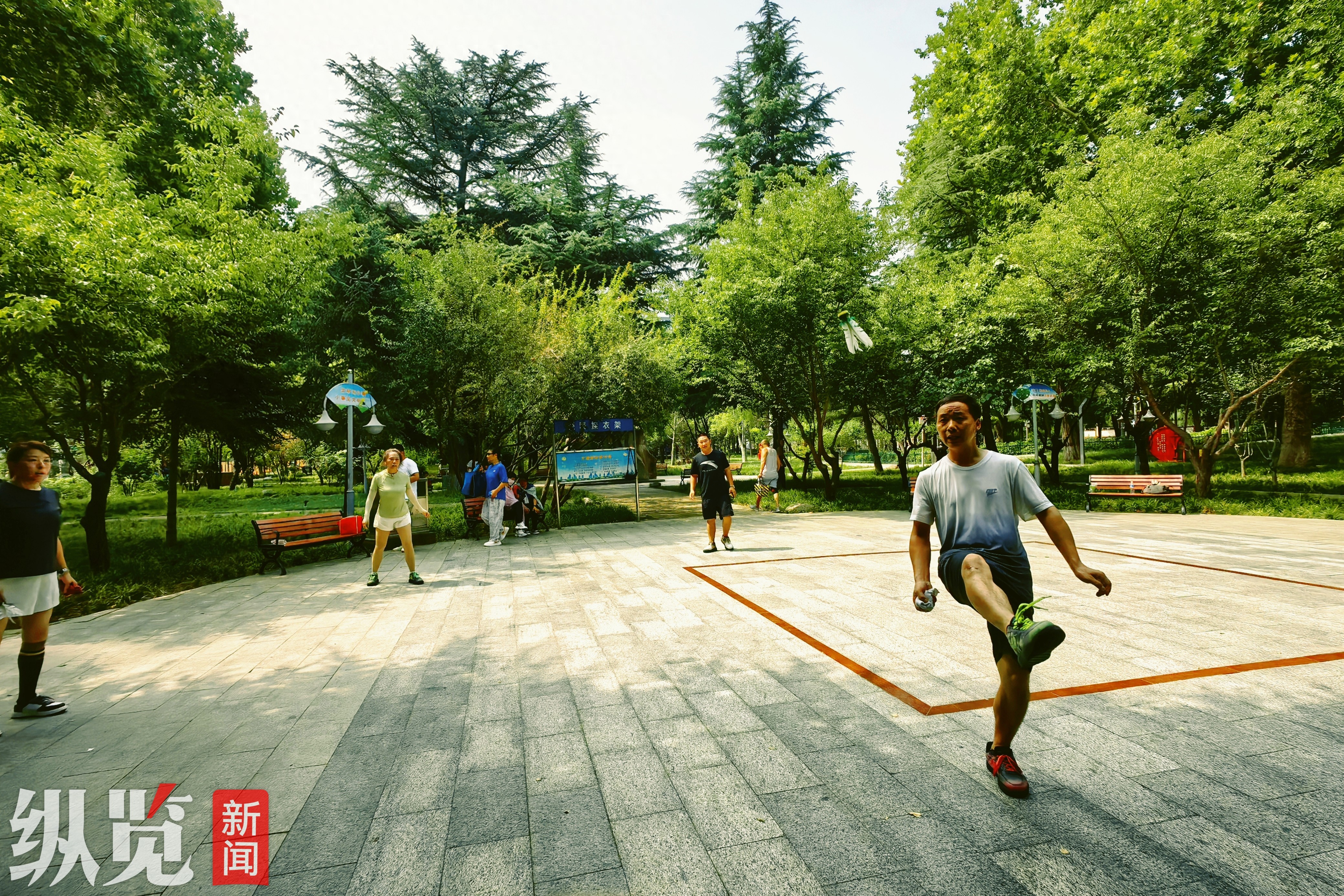 7月22日一早,纵览新闻记者来到位于石家庄新华区的河北省会儿童少年活动中心公园。只见松翠参天的大树下,踢毽的人们三五成群,“激战”正酣。毽子在人群间上下飞舞,却从不落地,吸引了不少路人驻足围观,人群中不时迸发出阵阵喝彩。