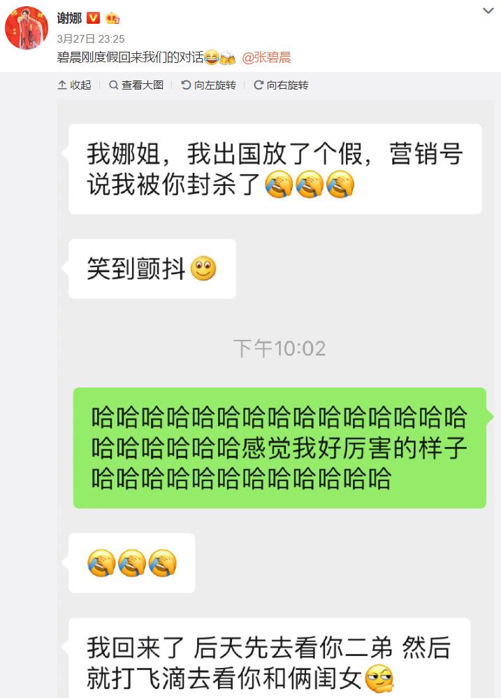 很快,谢娜就在微博上发了两人的聊天记录,张碧晨表示自己就是出个国,怎么营销号就说被封杀了。