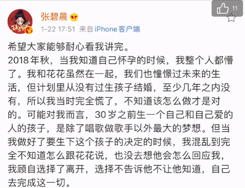 张碧晨写了一个长篇微博,从发现孩子出生到最终决定生下来,并且告诉粉丝们,她和华晨宇如今已经分手,只是会好好对待孩子。