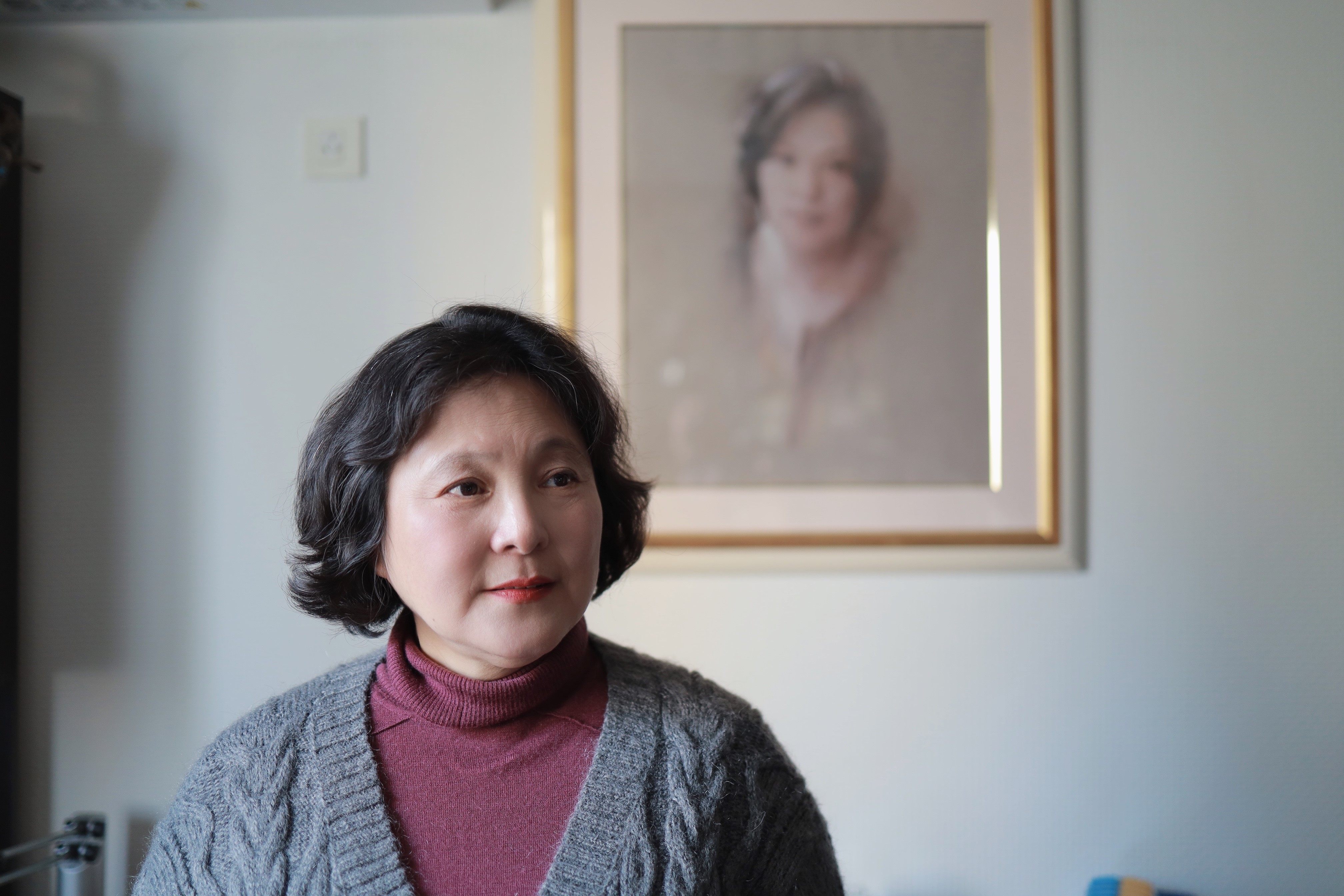 张芝华身后墙上挂着她的画像,正是丈夫查国钧的作品。澎湃新闻记者 薛松 图